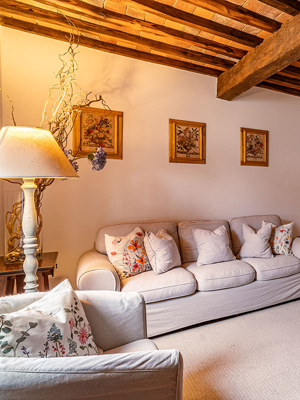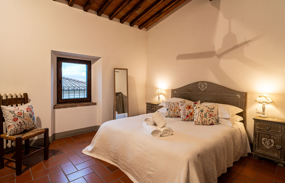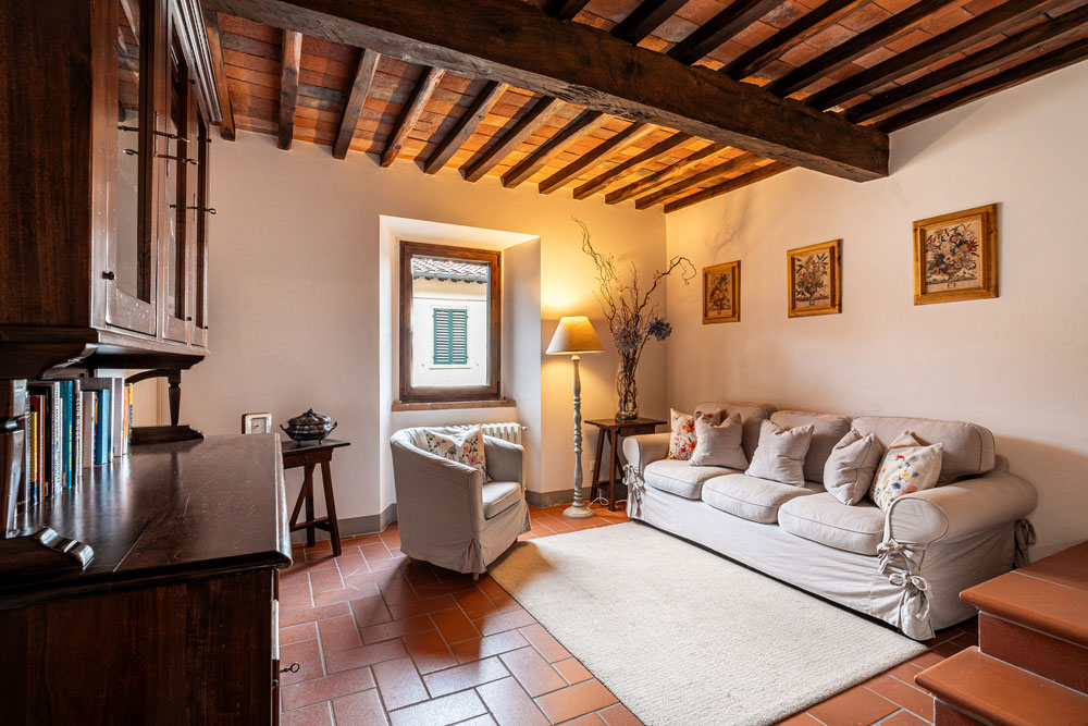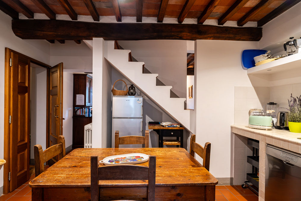 La casa dispone di due bagni completi con doccia, uno situato al piano d’ingresso e l’altro al piano superiore, dedicato alla zona notte. Le due camere da letto offrono massima flessibilità: una di esse può essere configurata con due letti singoli su richiesta, rendendola ideale per ogni tipo di ospite. La zona giorno, caratterizzata da soffitti con travi in legno, è il cuore del relax. Qui troverete un comodo divano, una poltrona e la TV, creando l’ambiente perfetto per riposarsi dopo una giornata alla scoperta del Chianti.